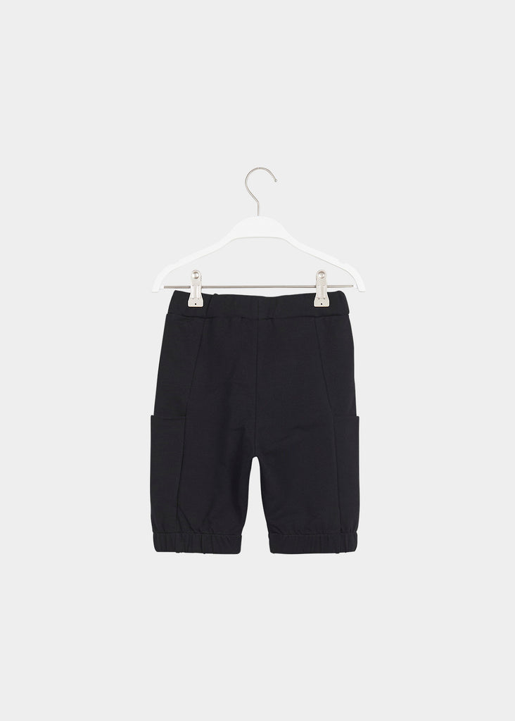 Lasten mustat luomupuuvillasta valmistetut collegeshortsit, joissa reisitaskut ja säädettävä vyötärökuminauha. Kuminauha lahkeensuissa. Normaali istuvuus.